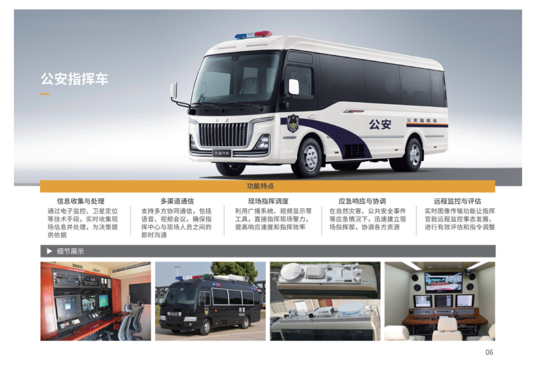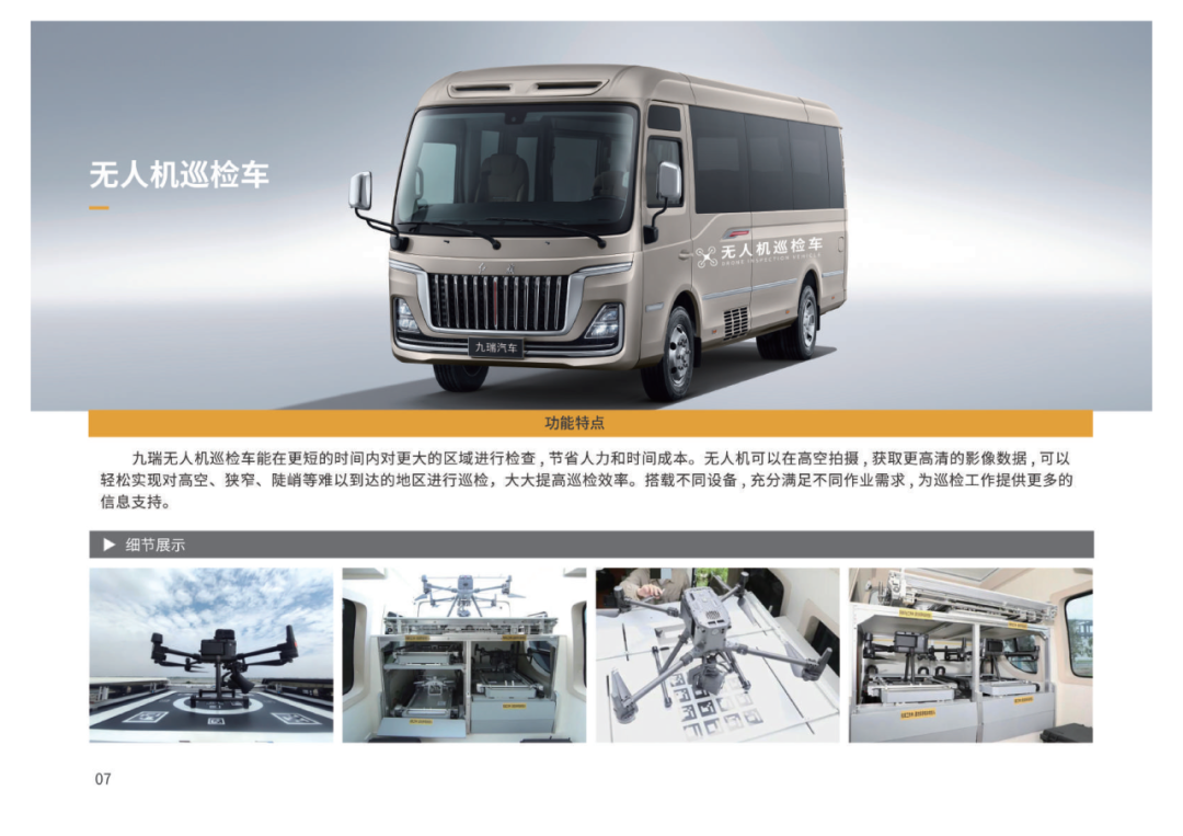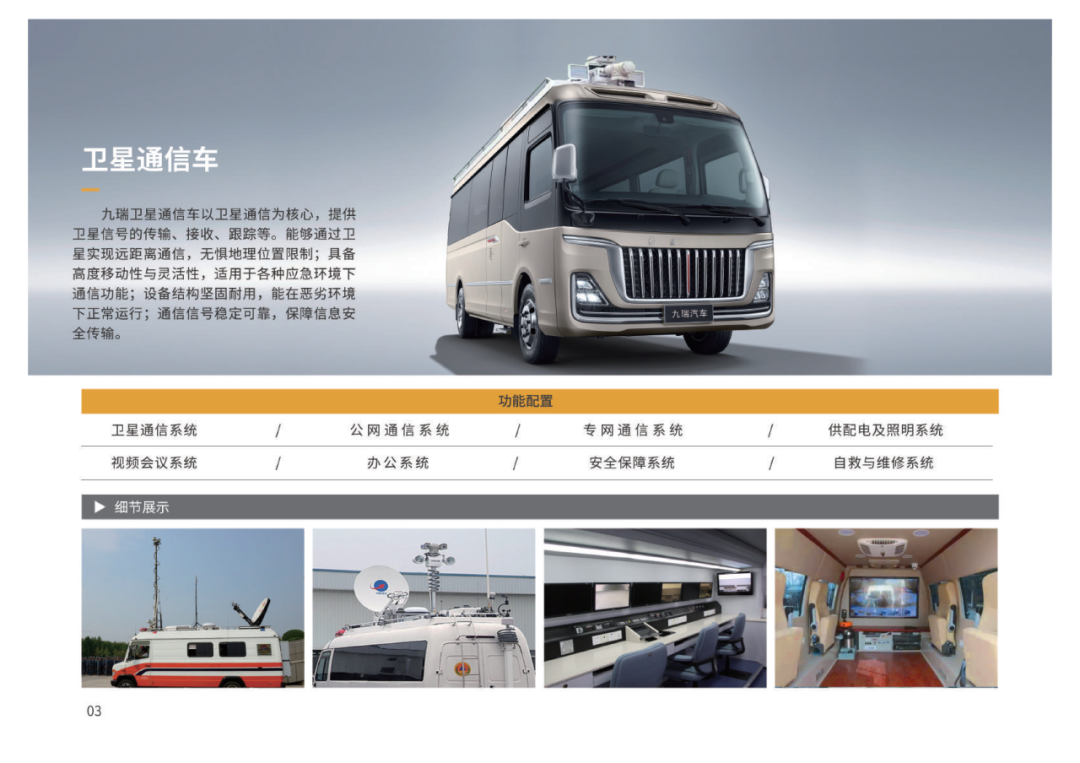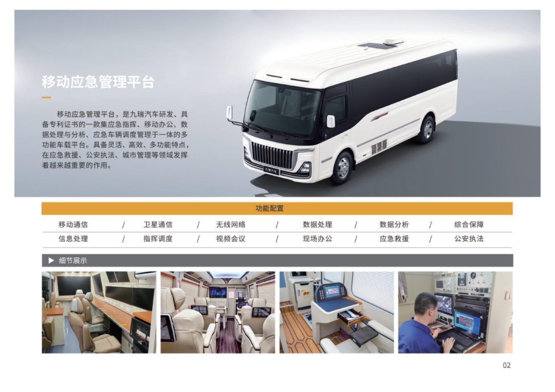 一汽紅旗與九瑞汽車強強聯(lián)合、雙向賦能,共同打造汽車生產(chǎn)廠商與應(yīng)急裝備制造企業(yè)優(yōu)勢互補、聯(lián)合創(chuàng)新的合作典范。 ·多功能指揮車 ·消防指揮車 ·移動衛(wèi)星基站車 ·衛(wèi)星通信車 ·移動應(yīng)急管理平臺 ·公安指揮車 ·無人機巡檢車 ·氣象監(jiān)測車 ·無人機反制車 ·危險氣體檢測車 ·礦山綜合救援車 ·商務(wù)車 ·健康體檢車 ·宿營車 ·機場調(diào)度車 ·醫(yī)療車